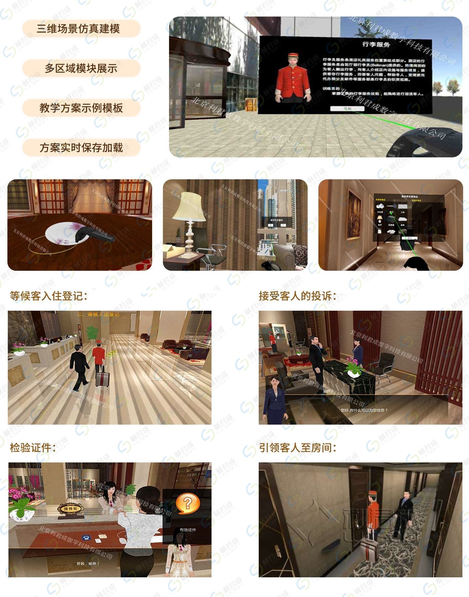 系統劃分為基礎知識,崗位職責,業務流程,情景模擬,案例分析,前廳部門六大板塊對酒店前廳知識進行系統的教學。內容涵蓋了酒店前廳預訂、接待、問訊、結賬、保險箱服務、行政樓層服務等重要服務環節的知識學習、流程展示、業務了解等,并通過三維動畫、視頻、文字、圖片、語音解說結合虛擬仿真場景的方式進行前廳重點業務的情景模擬,可提升教學效果、提高學生動手能力、促進教學改革。