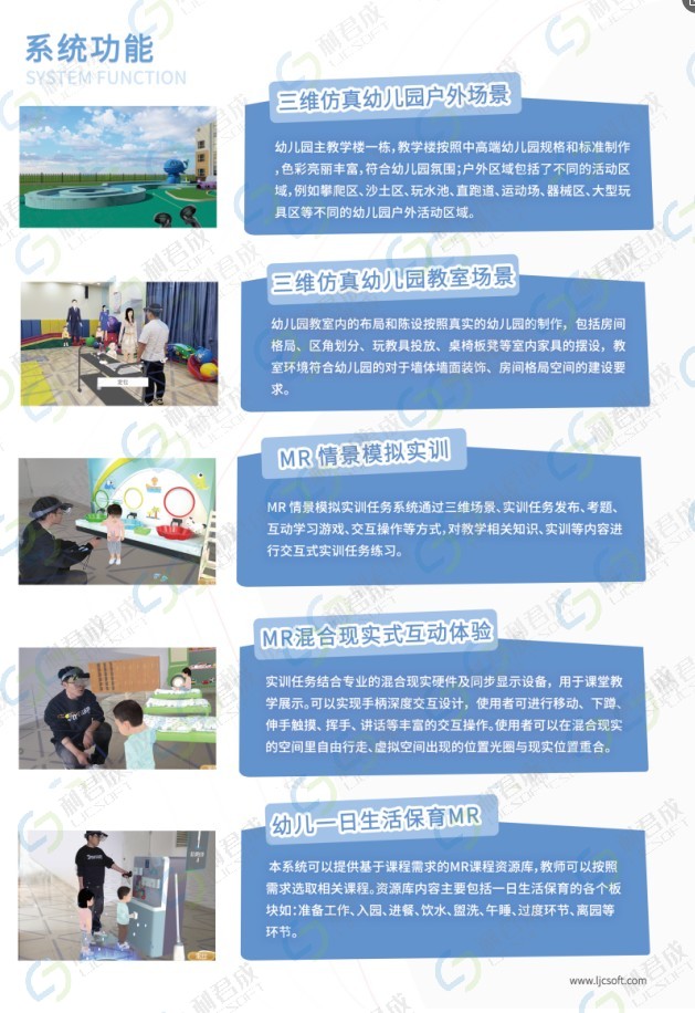 系統(tǒng)具備虛擬現(xiàn)實(shí)交融互動(dòng)、真實(shí)多場(chǎng)景實(shí)訓(xùn)模擬、實(shí)時(shí)互動(dòng)反饋合作、實(shí)訓(xùn)任務(wù)精確匹配等優(yōu)勢(shì)。一日生活保育MR教學(xué)系統(tǒng)+MR教學(xué)頭盔實(shí)現(xiàn)在線課堂學(xué)習(xí)、沉浸式練習(xí)、在線操作學(xué)習(xí)。系統(tǒng)包含入園、晨檢、午睡、進(jìn)餐、飲水、午睡、過(guò)渡環(huán)節(jié)等多項(xiàng)實(shí)訓(xùn)任務(wù)。