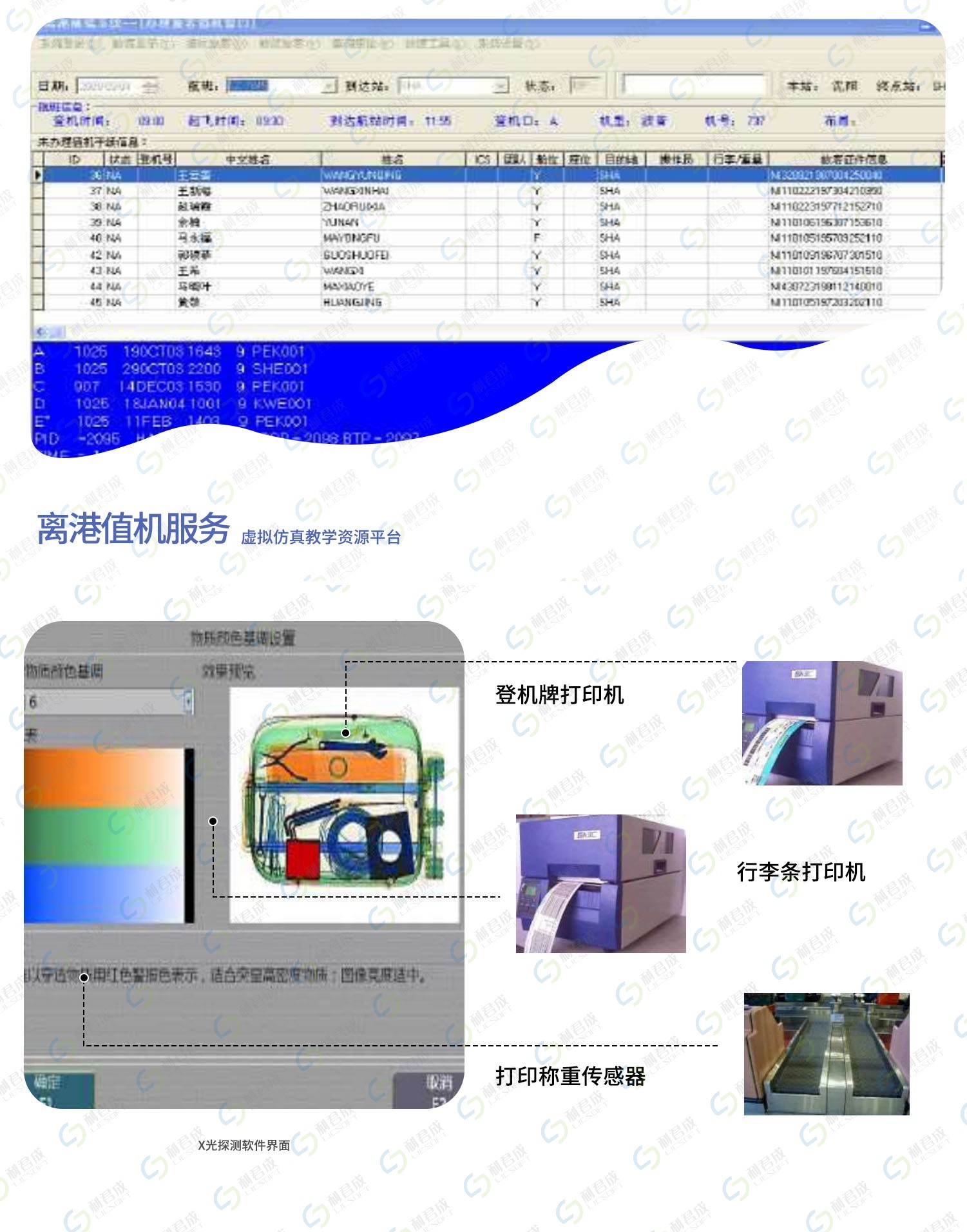 值機服務系統 值機服務系統具備以下訓練功能: 1) 圖形界面的NEWAPP 前端系統。新系統界面清晰、數據一目了然,易于操作; 2)具備雙機熱備份功能——先把存貯在主機上的旅客信息下載一份到本地備份, 如果此時突然與主機失去聯系,NewApp 將平滑地切換至本地備份模式下,繼 續利用事先下載好的旅客信息辦理值機手續,從而最大限度地保證正常工作; 3) 為客戶提供了良好的人機界面,和完整離港旅客處理功能;同時在本地建立 了 統一的機場信息平臺,集成了旅客信息、航班信息、到達城市信息等多種信息 源,為機場信息化提供了完整的信息源。 機票服務系統具備以下部件: 1) 值機柜臺; 2) PC 電腦; 3) 脫機離港軟件; 4) XAP-6210A 登機牌打印機; 5) XAP-6210A 行李牌打印機; 6) 行李稱重傳輸器DD7.ZD7.GD7; 7) 行李安檢設備; 8) 行李運輸分揀帶; 9) 熱敏行李條; 10) 熱敏登機牌; 11) 二代身份證閱讀器; 12) 二代身份證閱讀軟件; 13) X 光機教學軟件(含筆記本電腦)。